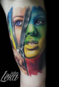 令人印象深刻的彩色女性肖像与拉链手臂纹身图案