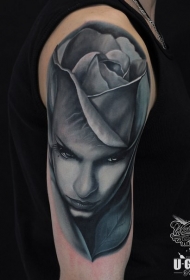 美丽的玫瑰与女性肖像结合手臂纹身图案