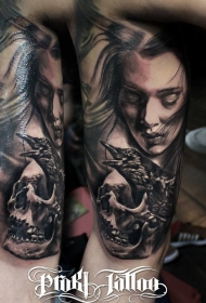 大臂黑灰写实的骷髅和乌鸦女人脸纹身图案