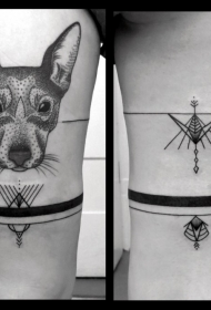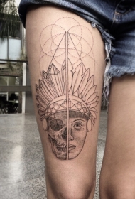 大腿点刺风格黑色印度人像几何装饰纹身图案