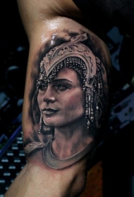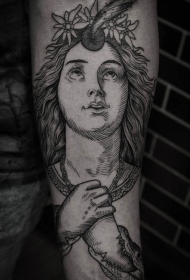 小臂雕刻风格黑色古代妇女脸和花朵纹身图案