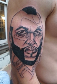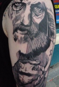 大臂雕刻风格黑色线条老人脸与老鼠纹身图案