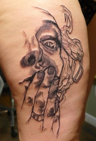 大腿恐怖风格黑色吸烟女性半脸纹身图案