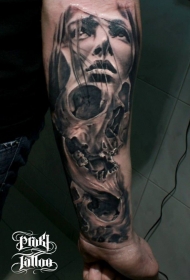 小臂黑灰风格妇女脸与骷髅纹身图案