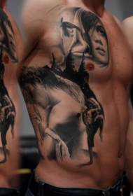 侧肋和胸部灰色女人脸与祈祷男子纹身图案
