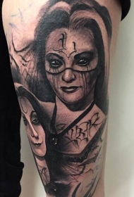 大腿恶魔般的黑色女人肖像蝙蝠纹身图案