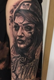 黑灰风格手臂神秘女人肖像字母纹身图案