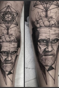 小腿黑色多种符号与男人肖像纹身图案