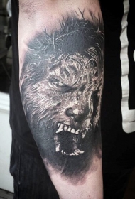 写实风格的黑白可怕狼人小臂纹身图案