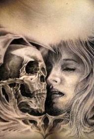 胸部黑灰风格女人脸和骷髅纹身图案