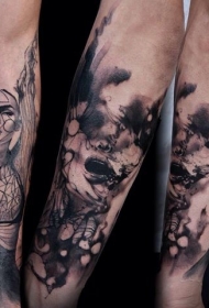 小臂黑色半骷髅半女人脸纹身图案