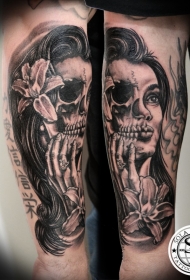 大臂恐怖风格黑白妇女脸和骷髅纹身图案