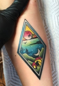 手臂纹身图片 男生手臂上菱形和山水风景纹身图片