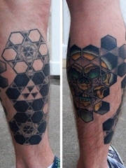 小腿上黑灰白色立体几何图形纹身图片
