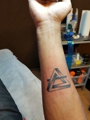 男性右手臂上黑色的立体几何三角形纹身图片