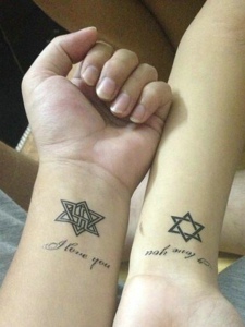 英文与六芒星结合的手臂情侣纹身图片