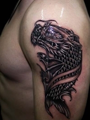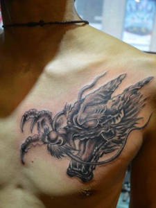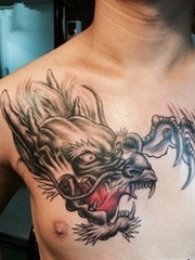 小腿五彩的神秘亚洲东方式龙头与花朵纹身图案