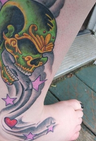 小腿漂亮的绿色骷髅与星星纹身图案