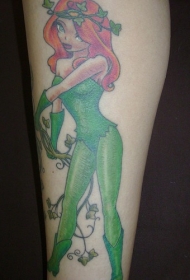 小腿美丽的绿色女孩红头发与植物纹身图案