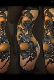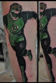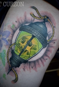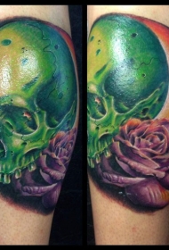 腿部彩色大头颅骷髅和玫瑰花纹身