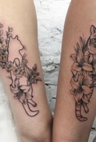 闺蜜手臂上黑灰点刺简单线条植物花朵和猫纹身图片