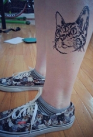 女生小腿上黑色点刺简单抽象线条小动物猫纹身图片