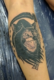 男生手臂上黑灰素描创意恐怖猫纹身图片