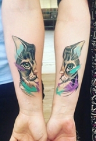 情侣手臂上彩绘抽象线条小动物猫咪拼接纹身图片