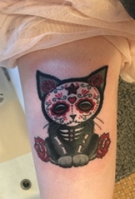 女生大腿上彩绘水彩素描创意可爱花纹猫咪纹身图片
