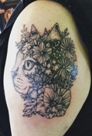 男生手臂上黑色点刺简单线条植物花朵和猫咪纹身图片