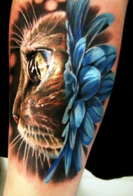 逼真的猫咪肖像和蓝色甘菊纹身图案