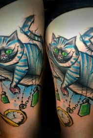 大腿彩色爱丽丝仙境中的猫和时钟纹身图案