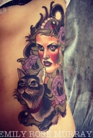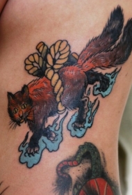 侧肋日本风格彩色猫与鲤鱼纹身图案