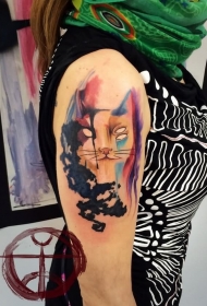 手臂日式彩色招财猫骷髅花朵纹身图案