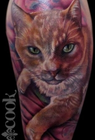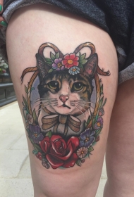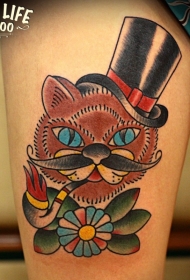 大腿old school彩色猫吸烟斗和花朵纹身图案