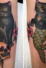 old school半色猫半美人鱼彩绘手臂纹身图案