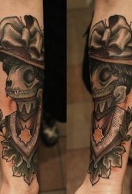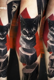 美丽的彩色猫与鸟头骨树叶手臂纹身图案