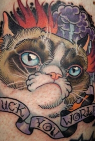 卡通风格的彩色猫与鲜花和手风琴手臂纹身图案