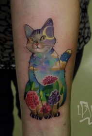 可爱的小猫结合花卉和夜空手臂纹身图案