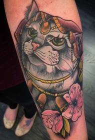手臂上可爱的猫公主和花朵纹身图案