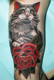 大臂漂亮的猫与红玫瑰纹身图案