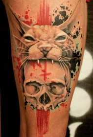 手臂令人毛骨悚然的血腥猫头与骷髅纹身图案