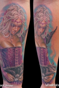 手臂彩色朋克小女孩和小黑猫纹身图案