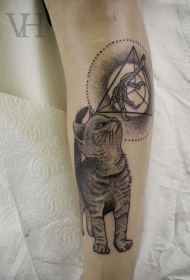手臂点刺猫咪和几何鸟爪纹身图案