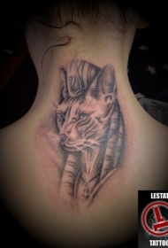 背部黑色的水墨线条与猫咪头像纹身图案