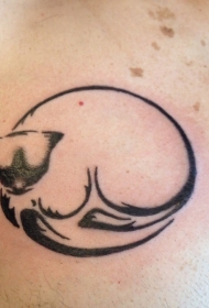 雕刻风格黑色邪恶的猫与树叶纹身图案