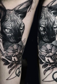 手臂栩栩如生的黑色无毛猫与花朵纹身图案