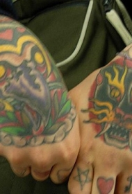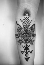 小臂雕刻风格黑色猫头与颅骨纹身图案