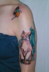 肩部现实主义风格彩色猫脸与小鸟纹身图案