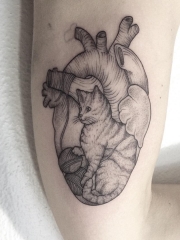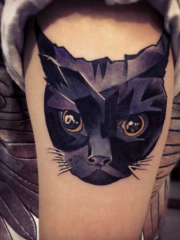 腿上漂亮的红色玫瑰花和黑色小猫纹身图片